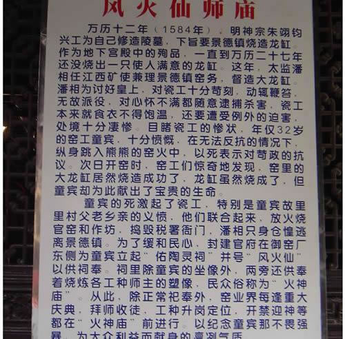 唐英《火神童公传》记载更为详细,也更为形象生动。神,姓童名宾,字定新,饶之浮梁县人。性刚直,幼业儒,父母早丧,遂就艺。浮地利陶,自唐宋及前明,其役日益盛。万历间内监潘相奉御董造,派役于民。童氏应报火,族人惧,不敢往,神毅然执役。时造大器累不完工,或受鞭笙,或苦饥羸。神恻然伤之,愿以骨作薪,丐器之成,遽跃人火。翌日启窑,果得完器。自是器无弗成者。家人收其余骸,葬风凰山,相感其诚,立祠祀之,盖距今百数十年矣。