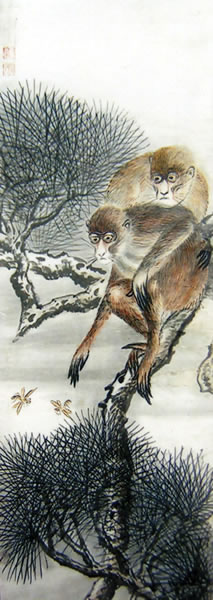 今年四月,我在一农户家里发现一张未经装裱的旧画。画面是两只猴子蹲在古松上,四只圆睁的眼睛紧盯着两只飞舞的黄蜂,构图十分简单,画意一目了然“坐等封侯”。落款处有两枚阳文印章,上方为隶书“童友仁”,下方为篆书“冠五”。