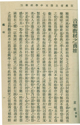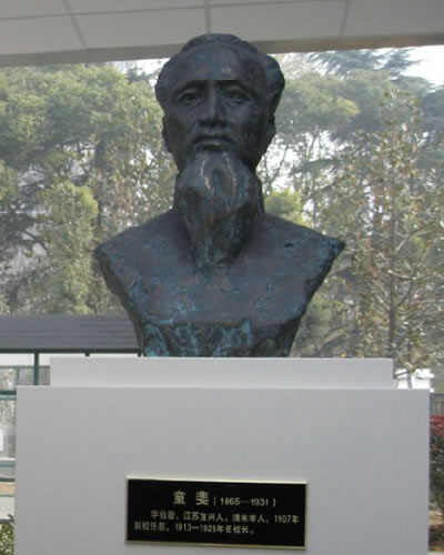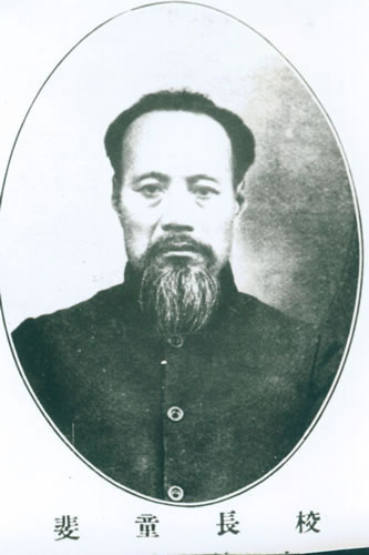 童斐(1865年-1931年) 字伯章, 1865年生于常州府宜兴县芳桥镇。幼时家道中落,几至赤贫,其发奋读书,师从本县精通四书五经且酷好昆曲、古乐的徐舍美栖宗亶卿(宗震名之父)13年之久。后童斐中秀才, 曾做塾师和官府幕僚, 又求学于江阴南菁书院, 1903 年中癸卯科举人, 此后任宜兴周铁竺西学堂校长。1907年11月常州府中学堂创立,应监督屠宽之聘任国文教员,1911年任学监。辛亥革命期间,童参与常州地区革命,任常州军政分府秘书长。1913年7月12日,按江苏省公署令,常州府中学堂改名为江苏省立第五中学,任命童斐为校长,兼授国文。他在该校共19年, 掌校12 年, 为该校解放前10 任校长中任期最长的一位。童斐是一位治校有方的杰出校长, 任职时正值北洋军阀统治时期, 政局动荡,办学困难重重。他呕心沥血,殚精竭虑,使学校蒸蒸日上,成绩斐然。童斐一上任,就为五中制订了校训:“存诚、能贱”,并制成两块匾额,悬挂在大礼堂的墙壁上。每当新生入学,童校长第一件事,便是讲解校训:“存诚,就是做任何事情,包括读书求学,待人接物,都要诚心诚意。能贱,就是不要以为进了五中,就自认高贵,仿佛处处高人一等,而不屑做一些平常的琐屑之事。要看得起普通人,要习惯自已做一切平凡的事。”著名语言学家吕叔湘曾回忆说:“1918年我进常州中学,童伯章校长为我们新生讲校训,两句话,四个字,一曰存诚,一曰能贱。我铭记在心,一生受用。”他文学功底深厚, 学识渊博, 才华横溢, 能诗善文, 讲授国文绘声绘色,深受学生欢迎。他指导学生作文,就同一命题, 亲自用三种笔法写出三篇不同的文章, 以激活学生的思维,一时传为美谈。童斐平日庄严持重,步履不苟,同学都称他为道学先生。然而他在课堂上却判若两人,国学大师钱穆说他上课“善诙谐,多滑稽,又兼动作,如说滩簧,如演文明戏”,学生都爱上他的课。一天,童斐讲授《史记·刺客列传》中的《荆轲刺秦王》,讲到图穷匕首见时,突然到讲台上翻开地图,赫然露出一把匕首,他迅速拿起,掷到课堂对面的一堵墙上,刀锋直插墙内,接着又迅速绕着讲台快跑,仿效荆轲追秦王的样子。同学都目不转睛、心情紧张地盯着他,仿佛又回到了那刀光剑影、诸侯争雄的时代。童斐绘声绘色、声情并茂的讲课风采对钱穆以后的教学产生了重要的影响。童斐管理素以严格闻名,聘用教师,则注重实际才能。1915年他聘用原在校肄业、年仅20 岁的刘天华回校任校军乐教员,不久又聘他为音乐教员,其后学校军乐队在历次全省运动会中均名列第一。他常与刘天华一起探讨改革音乐教学,曾尝试以基督教圣咏方式咏唱中国古典诗词等。童斐为刘天华日后音乐事业的腾飞铺设了平台。1932年刘天华逝世后, 不少人欲为之撰写墓志铭和碑文, 其兄刘半农说:“只有三个人才有资格给天华先生写墓志铭和碑文。 第一个就是童伯章先生, 他是首先发现天华的伯乐, 由于他的大力支持才使天华在常州五中教了7年书, 为以后跨入音乐界打下了一个坚实的基础”。童斐在课余游艺会成立昆曲组,教授学生昆曲。生、旦、净、末、丑诸角色,他都能一一分授演唱。刘半农、刘天华、瞿秋白、张太雷、钱穆、吕叔湘、储师竹等都跟他学习昆曲。校中经常彩排上演《长生殿》等剧,钱穆扮演《长生殿》中的郭子仪。瞿秋白则学唱过《拾金》一折。钱穆曾在《八十忆双亲》一文中说,自已到晚年犹能以丝竹唱曲自娱,实得益于母校昆曲组的培养。童斐不仅是他的国文老师,而且是他的艺术启蒙老师。他教授钱穆笛、笙、箫、唢呐、三弦、二胡、鼓、板等乐器的演奏技巧,钱穆尤爱吹箫,晚年说:“遇孤寂,辄以箫自遣,其声乌乌然,如别有一境,离躯壳游霄壤间。年逾七十,此好尚存。实为余平生一大乐事,则乃伯章师当年之所赐也”。 童斐还亲自作词编曲,用昆曲曲牌【解三酲】为私立常州中学校创作了《私立常州中学校校歌》,此曲旋律与文词字声配合贴切。旋律顺畅,跌宕起伏有致,具有古朴、典雅的民族民间音乐风格, 激励学子继承和发扬光大文化教育的优良传统。童斐还长于书法,闻名于常沪地区。曾书写字帖多本, 供子女练习,惜毁于“文革”。每当学生毕业, 他总为一些学生题词。他曾为毕业生夏翔(今为清华大学教授)书写一联:“古人惜寸阴,丈夫志四海” 。把精美的书法和深邃的哲理熔于一体, 这副对联, 至今仍悬挂于夏翔教授的卧室。