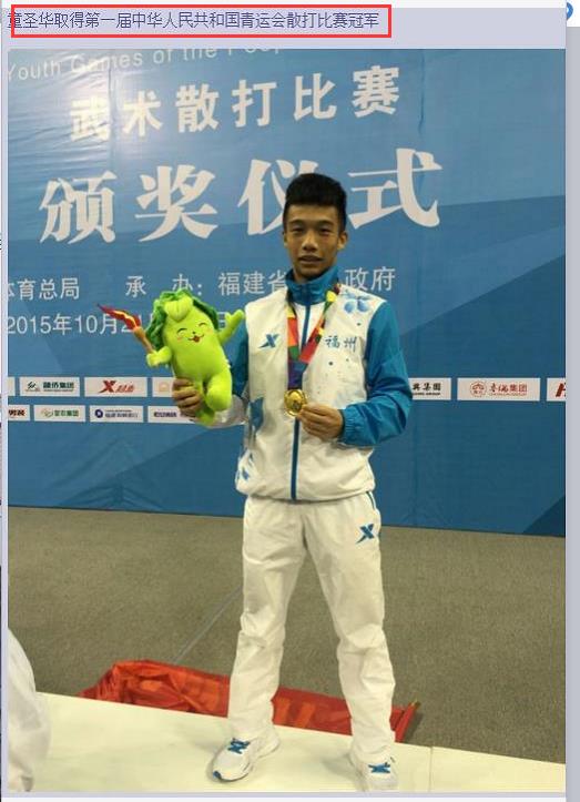 童圣华,男,汉族,1998年10月出生,于2007年6月进入龙岩体育运动学校散打队,2018年5月26日入选国家散打队。该运动员在2011年、2012年、2013年、2014年福建省青少年武术散打锦标赛中获男子52kg级第一名;在2014年福建省第十五届运动会散打比赛中获男子52kg级冠军;在2014年中华人民共和国第一届青少年运动会武术散打56kg级获男子团体第一名;在2016年全国冠军赛中获男子56kg级第五名;在2017年中华人民共和国全国运动会中获男子56kg级团体赛第七名;在2018年全国男子武术散打锦标赛中获男子60kg级第二名。