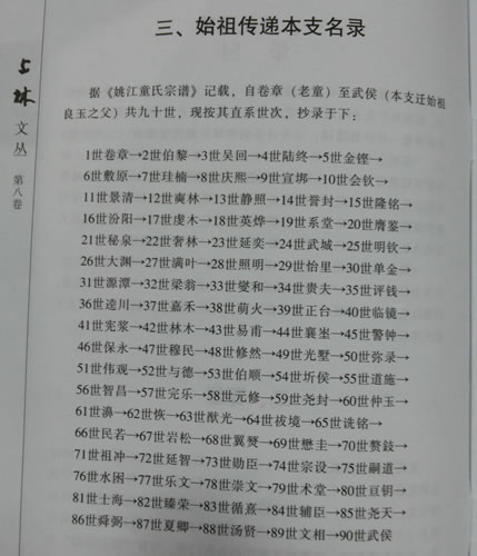 据《姚江童氏宗谱》记载,自卷章(老童)至武侯(本支迁始祖良玉之父)共九十世,现按其直系世次,抄录于下: