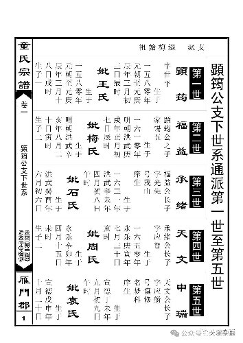 申瑞(应麟)公出生于公元一四二七年,接近历史真实,比较可信。假设按每代二三十年的 “代距”反向推算,并兼顾续谱标识的干支纪年,显支开头五世祖的出生年份,是否可以这样表述: 一世,显筠字世平公,出生于公元一三四〇年,元朝后至元六年,干支庚辰年;