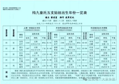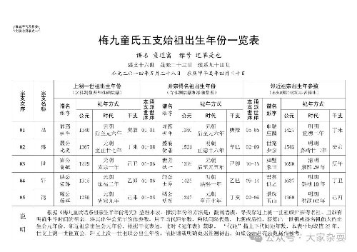 综合分析、考证,并类比、旁推,梅九童氏五支始祖若干生平年份,包含大约数据和准确数据,似可作出以下表述。