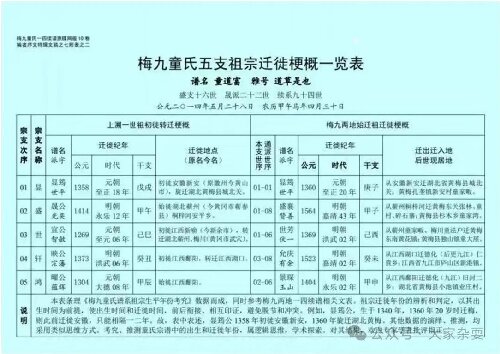 梅九童氏合谱,均载《五户自江西分迁各县始祖简表》(上溯一世祖迁徙简表)、《五户分迁黄梅始祖简表》(始迁梅九两地祖简表),展现迁徙的时代和地点。