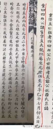 笔者阅谱时,心生疑问,为什么兄弟中有叫十几郎,又有叫秩几郎的呢?直到前几日,笔者百度查询到,“秩表示十年,10岁为一秩,秩年就是十年的整数年。”也就是说,秩即十,秩郎公也就是十郎公,这跟客家族谱记载的念郎公一样,念=二十=廿,即廿二郎公就是二十二郎公,廿记载在族谱就记载成念,这种现象在客家族谱当中很常见。那么,秩郎公(十郎公)又是什么年代的人呢?永定谱未记载,但是根据秩郎公上祖四四郎公(号坦庵)的墓志当中,可知四四郎公生于生元世祖至元辛巳年(1281年),秩郎公为四四郎五世孙,再结合秩郎公同辈永恕公生于1404年,可推测秩郎公(十郎公)应生于1400~1430年概率比较大。