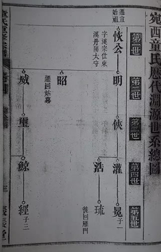 宛西渊源世系总图论成文于咸淳庚午六年即南宋1270年,本支以童恢为第一始祖。