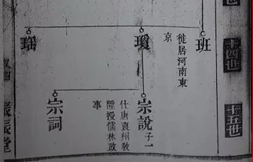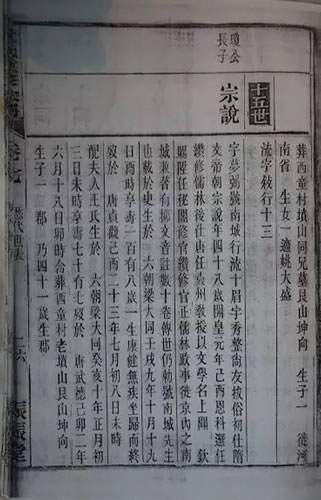 在宛西历代渊源世系图中,以恢公为一世祖,第十五世出现了宗说公,号南城先生,有注明其四十八岁开皇元年己酉恩科先任缵修儒林,后仕唐袁州教授,钦赐升任秘阁修官缵修官正儒林政事徙京内之。生於梁大同壬戌九年(南朝大同八年,公元542年,注壬戌年应为大同八年,而谱为大同九年)十月十九日酉时,享寿108岁,殁於唐贞观己酉二十三年(公元649年)七月初八日未时,一生康健无疾。配夫人王氏,生於六朝梁大同癸亥十年正月有初三日未时,享寿七十有七,殁於唐武德己卯二年六月十八日卯时,合葬西童村老坟山艮山坤向。四十一岁生一子。