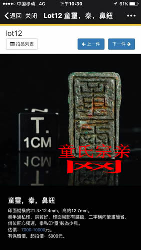 一枚“童玺”青铜秦印11月17日现身盛世收藏某微拍群,并以近万元被拍卖成交。