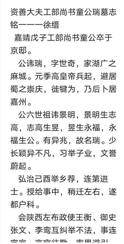 三、依据谱载和历代口传,字辈排行中的首字"尚"是指尚书,为纪念他拟为始祖。查史料文献及实地走访,寻获其生平事迹简历和墓志铭及墓地所在地乐山沙湾嘉龙镇。并获悉其六世祖景明生志高,志高生昱,昱生永福,永福生公的传承关系。以及有个弟弟童璋。