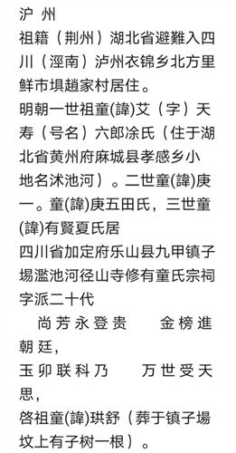七、综合以上资料信息,本次考证:历经十余载,时间从1350年到如今近700年历史,将所获资料抽丝剥茧,实地走访,通过微信QQ等社交平台,建群细心研究,仔细推敲古今地名变化和音同字不同的正确性,去伪存真。在乐山沙湾宗亲童永忠,峨边水凋宗亲童光艮,乐山童镇宗亲童成,雅安宗亲童学林,乐至宗亲童守远,重庆宗亲童志林,重庆大足宗亲童长彬,湖北宗亲童建新,浙江宗亲童惠平,浙江宗亲童海根,福建宗亲童杰章,湖南宗亲童威等的共同参与努力下,终获考证成果。反映了童氏宗亲的強大凝聚力。在增进宗亲间亲情的同时。得出如下简易迁徏过程和传承秩序: