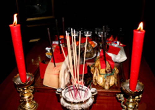 至下午晚饭前要请灶神下界过年,灶神廿三回天庭,年三十回到人间。举行接灶仪式后等到下午三点后方可举行祭祖仪式,各家在堂屋里,有祠堂的在祠堂里摆上供品祭祖。此时桌子要横放,设六席。豆腐,红烧肉,鲢鱼,黄酒,白米饭,年糕,粽子为必须,一些人家还放糖,水果,茶等。最少不得少于六盘菜,一般为十二盘。祭祖时间要长,祭祖后方可自己吃年夜饭。