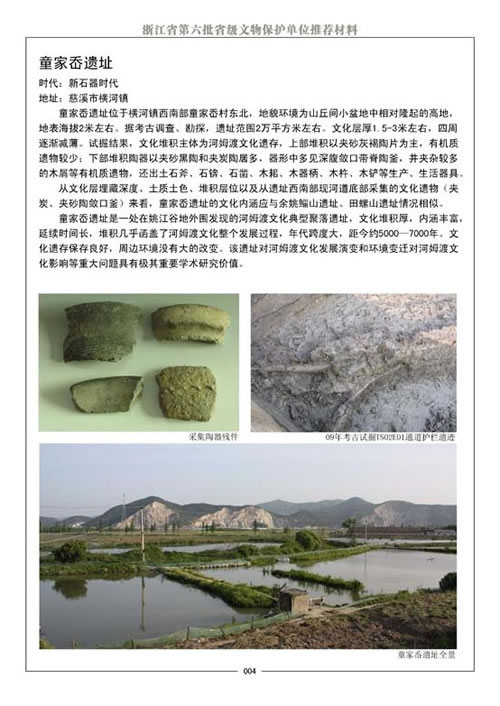 童家岙遗址内涵丰富,保存较好,是一处值得重视的河姆渡文化类型遗存,对研究浙东一带的自然面貌、地理变迁及人类文明史,都具有较高的史料价值。1986年8月,慈溪县人民政府把童家岙遗址公布为第三批文物保护单位。(文章出处:慈溪市博物馆)