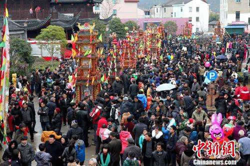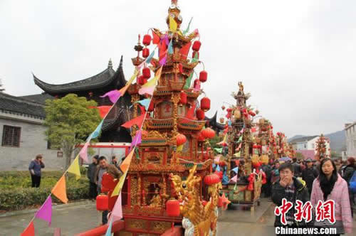 中新网宁波2月14日电(记者何蒋勇通讯员严洁李江林)有些500年历史、持续两天的元宵行会在千年古镇——浙江省宁波市宁海县前童古镇上演。民众抬着18杠鼓亭、抬阁,一路上浩浩荡荡,引来成千上万村民和外地游客驻足观看。