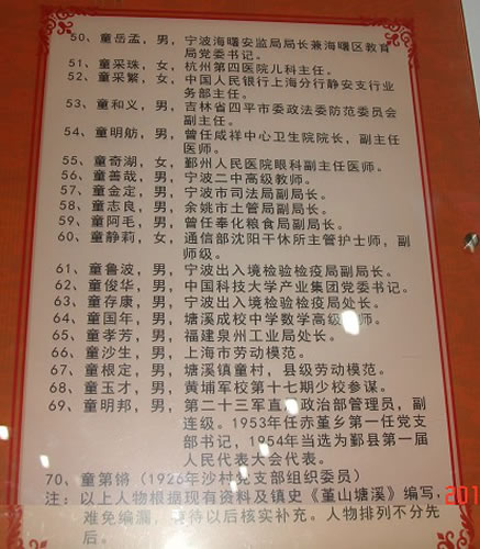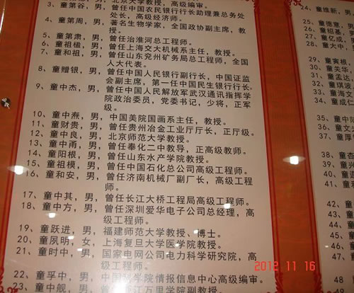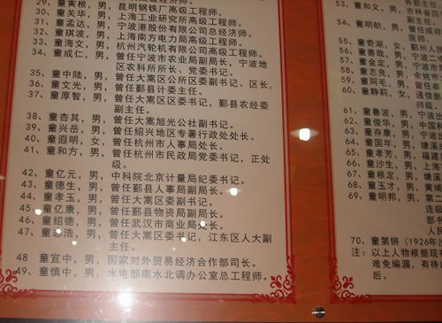 2012年11月16日我有幸受浙江宗亲会的邀请参加该届年会并获得了优秀通联员一等奖的荣誉,受到热诚的欢迎和友好的接待,感受到了宗亲血浓于水的亲情和族谊,这既是肯定,又是鼓励,同时更是鞭策,也是一份责任! 我怀着一份虔诚之心:进童村,受洗礼。童村民风淳朴热情好客,崇文尚德倡教育才。瞻仰了雄伟高大的童氏宗祠与科学泰斗童第周的故居(“童氏宗祠”四个大字苍劲有力,有如行云流水,由著名书法家沙孟海所题写。童沙两家是友好世家,宁波的名门望族)。童氏宗祠一副对联说得好:世上百种善举无非积德,天下第一好事还是读书。读圣贤书,立君子品,做有德人。参观期间童中高宗亲讲解了童村的历史与人文典故,使我对童村又有了进一步的了解与认识。《童氏家族》一书的作者胡纪祥老师欣然赠书并且为我亲笔书写:"童氏宗亲友谊长存"赠与我留念。更值得一提的是与科学泰斗童第周之子、教授代表童时中合影留念。童时中老教授温文尔雅,行事低调,不事张扬,他是大学教授,也是名人之子,但他朴素务实和蔼可亲平易近人,令人钦佩!我们还进行了亲切友好的交流,受益匪浅!深深感受到雁门邹谷童氏的文化魅力与传统的优良家风!敬佩之情油然而生,无法言表!童村耕读传家久,历来十分重视教育。童村已有上千年的历史,人文底蕴深厚。现有738户2000余人口,是个山清水秀,风光优美的古村落。官方公布的童氏教授就有78人之多。就科学泰斗童第周让房一脉二个辈份统计就涌现十九位教授,是闻名遐迩的“中国教授之村”。
