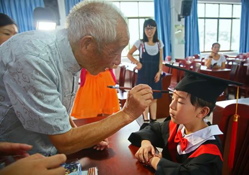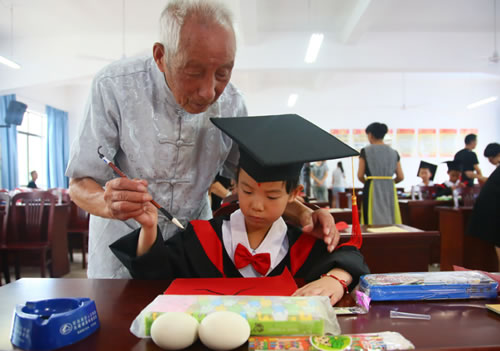 当大学新生童山石与将入学的小弟弟、小妹妹分享了自己的学习心得后,启蒙礼开始。孩童们穿着“博士服”,行了拜师礼。今年已是95岁高龄的退休教师童中方老人,一边为殷殷学童点上朱红“聪明记”,一边笑容可掬地对笔者说:“自始祖迁到此地,世代尊师重教。”