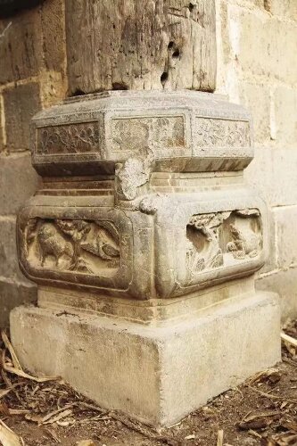 大院所有建筑雕梁画栋,有花鸟,动物,人物故事等。地面全用青石板精雕砌成。整个大院呈阶梯形分布,南高北低,错落有致。从院坝进大朝门再到下厅经四角天井到上厅堂屋,要走三进门三阶梯。院坝呈半月形,品字形台阶配八字形大朝门,朝门两边各配一根大亮柱,亮柱下是两座高一点二米,直径一米左右的大石磴。石磴构思奇妙,雕刻精巧,连体小狮子形态毕真,好象在欢迎客人的到来。朝门高六米,木结构,上盖青瓦,两边与围墙相连。门高四米,宽两米。双开门,门板厚半尺,由坚硬的实木做成。门座用整块大青石雕成。开关门要两个人用力才能合开合关。一对石狮威风凛凛镇守朝门。撮箕形全木吊脚楼在院左上角,又名上院或后院。有一小围墙与大四合院隔离,从大四合院左角上十多步台阶进小朝门即到。吊脚楼紧挨后山,外脚楼檐虚空,十分壮观。