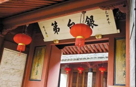 一进门,门两边写着,古红莲阁,今白华堂。也说此地在宋为红莲阁,今白华堂则是童槐的堂名,宅右有书楼,也是一个藏书之处。从私家园林的角度来看,其实现今的银台第没有假山水池,不过银台第外面就是月湖,“门前千杆竹,家藏万卷书”。