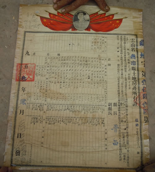 这次去南华见到与童家历史有关的几件物件。一件就是土地房产所有证,发证时间为1953年2月,发证单位为镇南县,也即目前的南华县,地址为第二区红图门乡(镇)童姓村,也即目前的龙川镇红土门村。编号“地字第15616号”,上有五星红旗和毛泽东像。当时的县长是晋西。户主是童登雄。证件的内容是土地与房产(周边界限、数量等),每项写的很清楚。另外就是法律规定:“......完全自由任何人不得侵犯”。