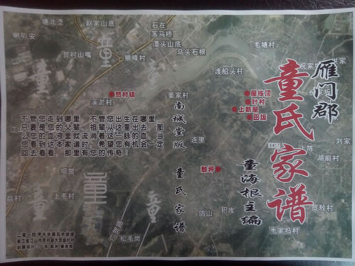 封面则写有“雁门郡 童氏家谱”及主编,同时把所在地村名改成红色,并放置在显眼位置,那样让人一看就知道家乡的位置,山水不变,在外的游子任何时候都能找到家乡。