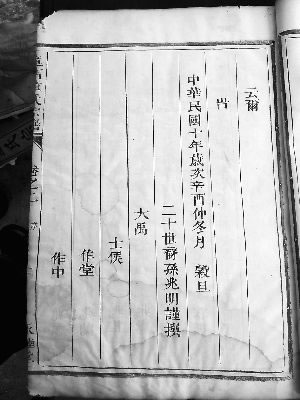 该《童氏宗谱》修于民国十年(1921年),木刻版,每部分卷一、卷二,二册,共五部,按“礼义仁智信”的字号领谱。童小宝家有义号二部、礼号一部,还有一册(卷一)是光绪年间的。我仔细地翻阅了这些宗谱,获知童店童氏于宋乾德年间由始祖庆二公有爱从淳安迁居兰溪,其子阡一公廷壁由黄岗转迁童店。其中一部“义”字号和另一部“礼”字号的内容一样,另一部修于光绪年间的《童氏宗谱》卷一的主要内容和修于民国十年的也没有多大的差别,其中都没有涉及太平天国的事迹。按常规,修于同一时间的每部谱的内容应该都是一样的,所以也就没有必要再去翻阅其他相同的宗谱了。