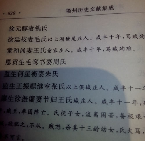 童寿发妻朱氏,童家庄人,咸丰十一年,遇贼,不辱遭害。P636