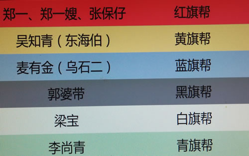 广东海盗有红、黄、蓝、黑、白、青六大帮。六种旗帜在海面上飘扬,难免会产生冲突。在郑一还活着的时候,他们就定立了一个公立约单,规定了在绑架人质、抢劫船只、作战的过程中不能发生冲突,以及如果发生冲突该如何解决。