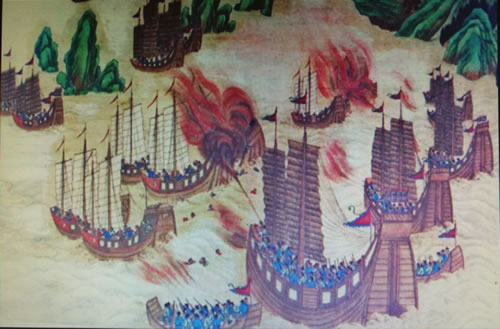 海盗到底是如何劫掠打仗的呢?当时船上没有动力,作战主要靠的是火攻和炮攻。船上会有很多门大炮、小炮。正面的人把装满硝磺、油布的火药罐扔过去,或是把沾满油的棉花点燃,用弓箭拉出去射向对方的船篷。船篷一着火,船停了下来,再用带铁钩的竹篙,把对方的船拉过来,用冷兵器展开近身作战。