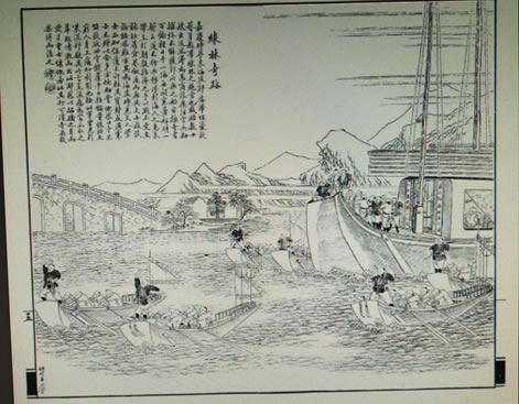 这张是晚清时期著名的画报点石斋画报,题目叫“绿林奇境”,描绘的就是郭婆带的船。船上有一副对联:“道不行乘桴浮于海;人之患束带立于朝。”这也是郭婆带写的。大家可以看出来,他还是挺有文采的。当时招安的清朝官员都感到很惊讶,说“此海盗非常人也”。