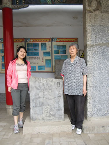 童署明的女儿(右)童德美、外孙女卢兢在残缺的石碑前留念