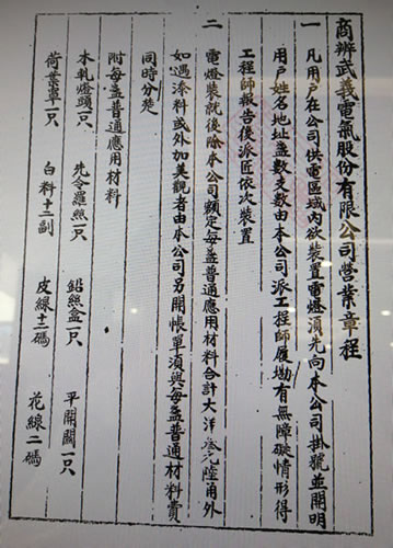 武义电气公司的章程是民国21年(1932)12月由经理童子照拟写并手书,上报省建设厅审批修订后施行的,其内容与义乌电气公司章程应该有许多相识之处。从中,我们可以窥见电气公司发展初期的电灯等材料种类、进货地点、包灯制、收费标准与缴费办法、检修方式等一整套较为完整的操作与管理程序,甚至对偷电与员工廉洁方面都做了规定。
