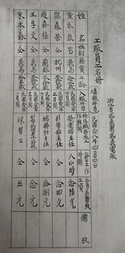 员工的情况变化就比较大了。其《浙江省武义县武义电厂工厂员工名册》记载:当年员工人数仍然5人,但具体人员已有很大变化,除了老员工王孚文外,其他4人基本上是新加入的员工,且5人中义乌籍有3人。