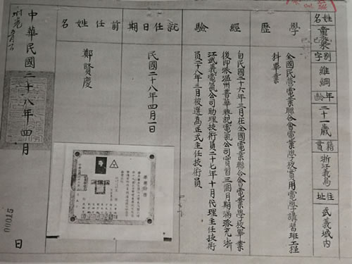 民国28年(1939)5月,武义电气公司经理童子联呈《为改聘主任技术员函》给武义县县长,县长叶文收到后呈送省建设厅,5月5日省建设厅收到武义县呈送武义电气公司主任技术员履历及毕业证书摄影,存档并转呈经济部。看来民国时期对商办电气企业的经理、技术人员的管理还是比较严格的。该函后附公司主任技术员履历及毕业证书摄影各一份。