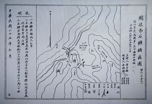 (6)民国二十五年(1936)九月十一日童子联谨呈浙江省建设厅厅长伍:计呈送矿图五纸、测量簿记二纸、查勘费二十五元。附民国二十五年九月石脚桶矿区图。