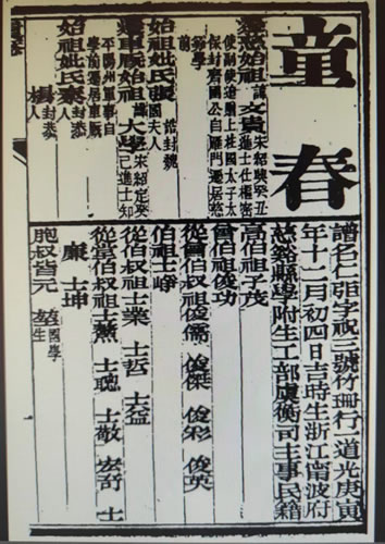 自从本人由2015年7月在童氏宗亲网上发表《慈溪车厩童氏索源与迁徙年份的考证》一文后引起广大热心宗亲的关注,有宗亲打电话来认祖的,也有宗亲寄来了有关慈溪车厩童氏的珍贵史料,特别是江苏省宜兴市芳桥童氏宗亲童强寄来的收藏于南京图书馆晚清举人童斐试卷影印件和兰溪市童惠平宗亲发来的清光绪十二年丙戌科进士童春的朱卷影印件。这两份朱卷史料,进一步证实与解惑了我历时三年走访并由2017年8月发表在童氏宗亲网上的《浙东童氏寻访记》中的一些疑惑,更进一步明晰了慈溪车厩童氏迁徙年份与迁始祖的脉络。