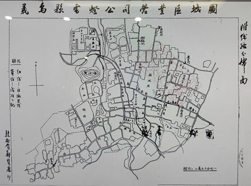 民国时期义乌县地图所见不多,城区地图更为稀见。笔者有见民国37年(1948)《义乌县全图》中的《义乌城厢附图》是比较清晰专业的县城图。上图是《义乌县电灯公司营业区域图》,实际上就是当时的《义乌县城区图》。笔者考证它是民国16年(1927)义乌电灯公司技术员郑贤庆,根据当时内部测量绘制的义乌城区图标注红蓝线改制而成,红线为区域界线,蓝线为线路分配,由于地图复制成黑色,加标的红蓝线无法区分,但整个义乌城区的分布还是相当清晰的。该图比1948年《义乌城厢附图》早了21年,真实地记录下了1927年间的历史地理信息,因而弥足珍贵。