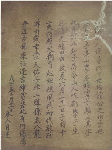 十二失恃,赖父蘜育,勉绍祖风,民初代教,荏苒卅载,幸蒙天佑,子非三凤,孙至八龙,年近古稀,康强逢吉,虽贫若此,有何伤焉。