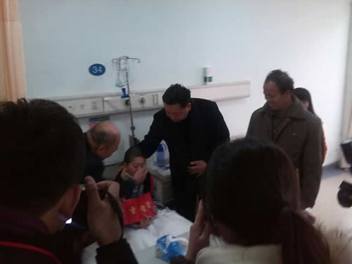2014年1月15日,安徽宗亲会童青会长、童寿春秘书长等宗亲长途驱车赶赴西安医院慰问病童童海涛,安微宗亲共捐助20700元。图为慰问场景。