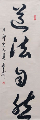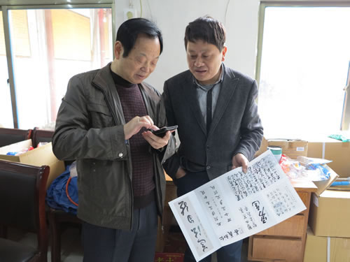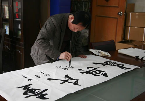 童颜在展示他的书法作品