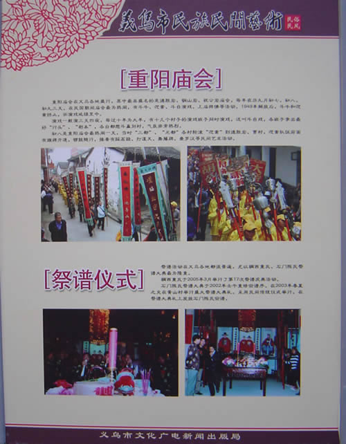 新形势下,非物质文化遗产保护工作怎么进行?这是个新课题,也是个难题。现在义乌市对非物质文化遗产项目的保护主要有两种:一种是活态的保护,如民间手艺类,政府鼓励有一技之长的老艺人带徒学艺,采取措施,给予扶持或给予一定的补贴;而表演艺术类,则尽量把他和老百姓的民俗活动、节庆活动以及商贸活动结合起来,使之成为老百姓生活的一部分。同时,政府通过组织,搭建平台,推动群众文化活动,让他们得以表现,得以传承。另一种就是将当地有代表性的非遗项目,编入乡土教材。通过学校教育、传授相关知识技艺,培养少年儿童对民族传统文化的感情,了解什么是中华民族文化。而今首先要做的,就是动用各种手段,如用文字、图片、音像等把它完整记录下来,保存起来,展示出来,使之在我们建设社会主义先进文化的过程中依然能够发挥不可替代的作用,并体现出深远的历史价值和研究价值。