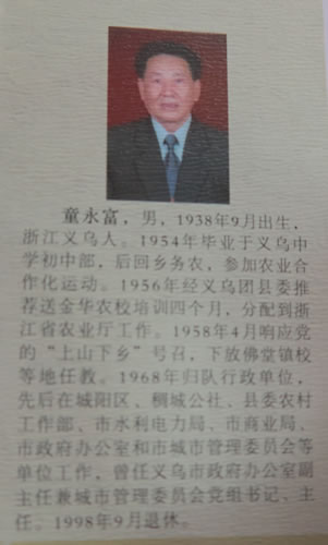 童永富,1938年9月出生,1998年退休,曾担任义乌市政府办公室副主任兼城管委主任、义乌稠西童氏修谱理事会及义乌市童氏宗亲联谊会理事,并为2004版义乌《稠西童氏宗谱》作序。