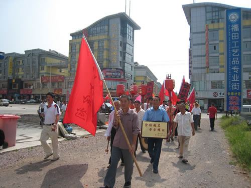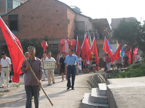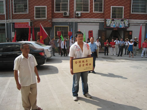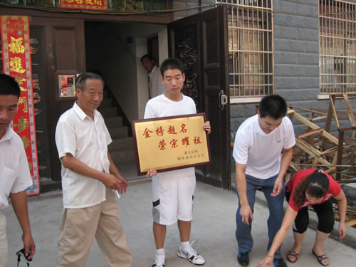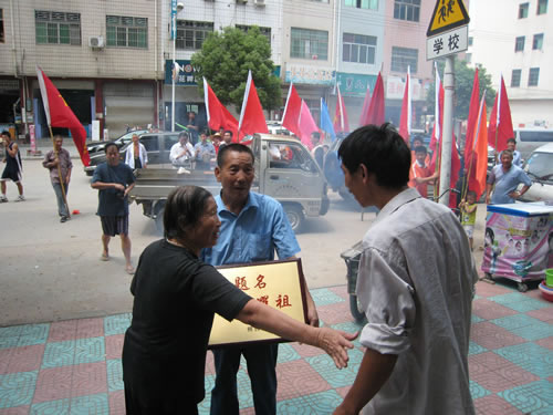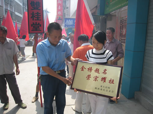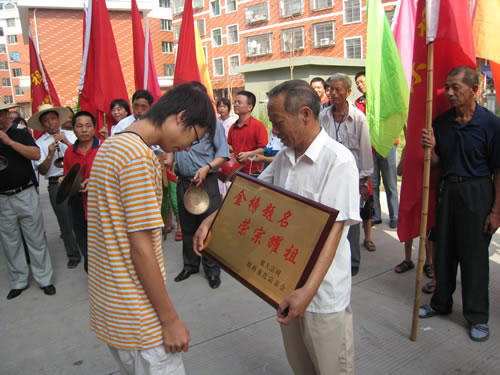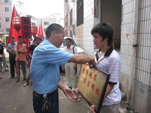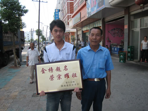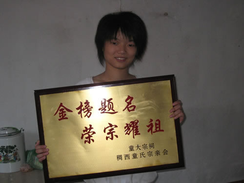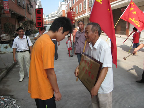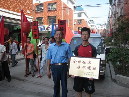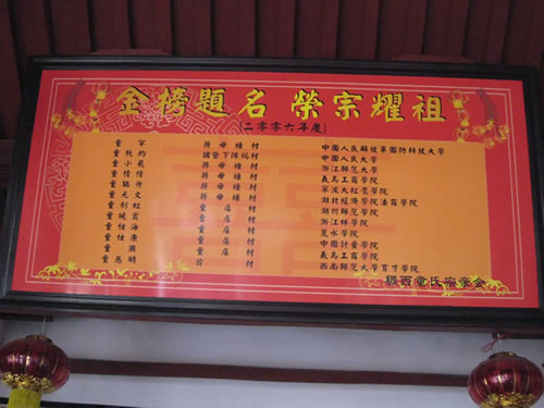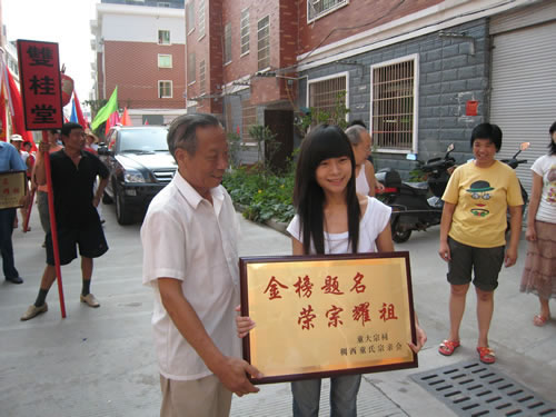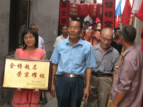 这是义乌稠西童氏宗亲会连续第二年举办的为大学生送匾活动。2006年,稠西童裔已有15人考上了大专院校,宗亲会敲锣打鼓地为他们送了匾,为他们上了一堂生动的传统文化课,