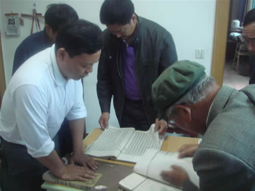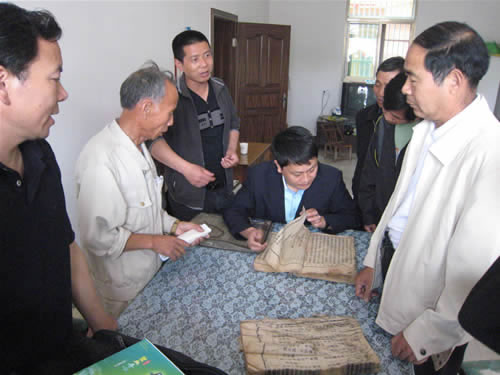 9时,我们找到了浦江县黄宅镇智勇村童村自然村。童克局老人与童福昌等宗亲已在村口迎侯。一阵喧寒后,他们电话找来邻村的一位童姓老师。童老师珍藏有一套童姓老谱,惜仅存第1、3卷,第2卷已失。据说,这还是他从贵州一位童姓老人处找回的,因此弥足珍贵。