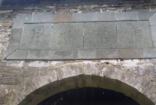 根据他们的介绍,在里童坑村口东头有一路亭,很有年份。沿水泥路向东走到尽头,再走约二百多米土路后,便到了路亭。亭不过四五米见方,高约三米多点,东西两侧为砖墙,各有一拱门洞,南北两侧则是中间有一柱落地,无墙。在东面拱门洞上有一石匾,上书“童源古里”四大字,东侧前分有二条小道,左边一条可通往县城,另一条则通往其他村。在西面拱门洞上亦有石匾,上书“笔峰拱秀”四个大字,落款为“乾隆三十七年菊月里人童兆题”,文笔刚劲有力,给人的感觉功底十足。此亭至今已经有二百四十三年历史。现在,除了一条老路从亭中东西向穿过外,南侧是一条新开的通往采石场的拖拉机路。据说此亭原来是要被拆除的,由于村民不同意,才将山体挖掉,道路从目前亭的南边上走。