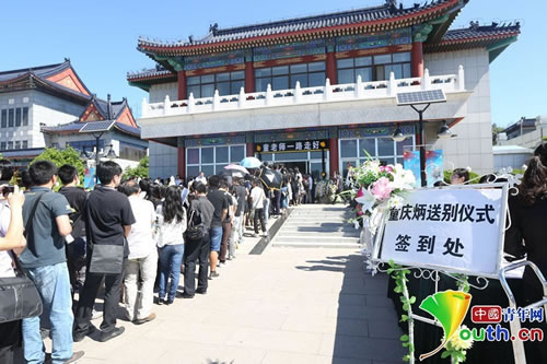 9时许,人群开始步入告别厅送童庆炳最后一程。厅内哀乐低沉,童庆炳面容安详,仰卧在大厅正中。不时有群众献上花束,时间不长便堆满灵前。面有悲色的家属站立一旁接受人们的劝慰,整个仪式约持续一小时左右结束。