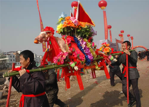 义乌西门童氏抬着一组组猪羊祭品正从童大宗祠出来。“好大的大年猪!"