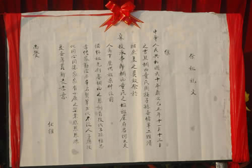 维 中华人民共和国六十岁次已丑十一月十三日之吉旦,稠西童氏裔孙四鹤、昌茂率合族子孙,备猪羊二牲,清酷庶羞之奠,至祭於宋授承事郎、稠西童氏始迁祖廉府君及何太夫人属下列祖列宗神前,伏维,我祖德泽,炫耀嗣裔,昌盛荣华,感恩思源,缓备薄奠,敬告先灵,伏冀式临,聊申孝享,尚饗。