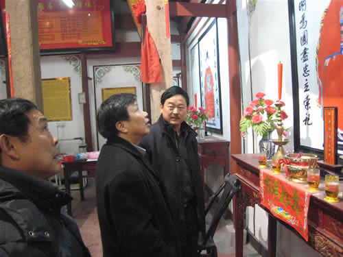 这是童禅福(中)在童仕明(右)、童起明(左)等宗亲陪同下参观义乌童大宗祠,仰瞻了童必大等童氏先祖的容像。