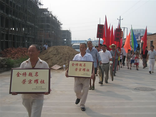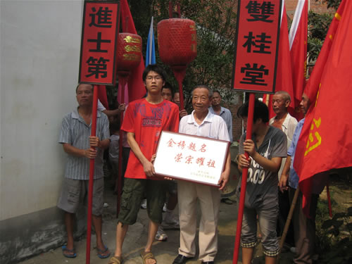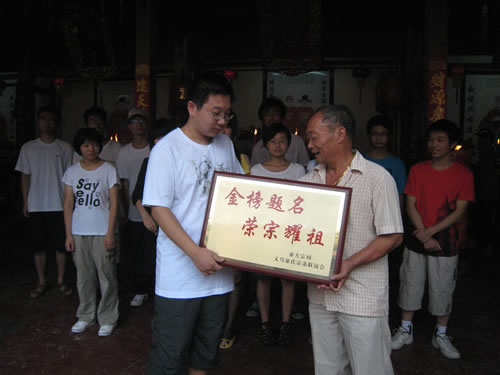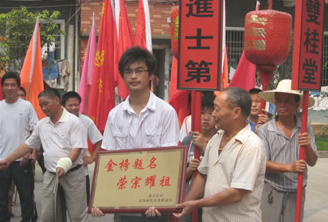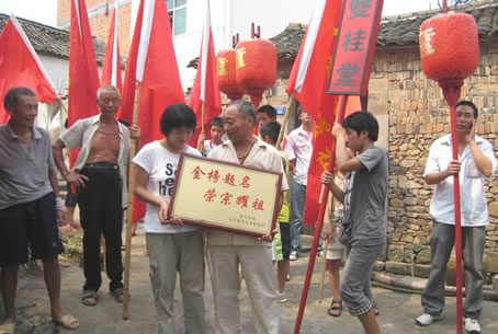 祭拜祖先后,稠西童氏组织了二十多辆专车,一路敲锣打鼓,鸣炮奏乐,浩浩荡荡地从蒋母塘童大宗祠出发,童姓长者们亲手将一面面题有"金榜题名、荣宗耀祖"的铜匾送到大学新生们家里。他们还将历年大学新生的名单制成光荣榜,高高悬挂在童大宗祠的墙上。