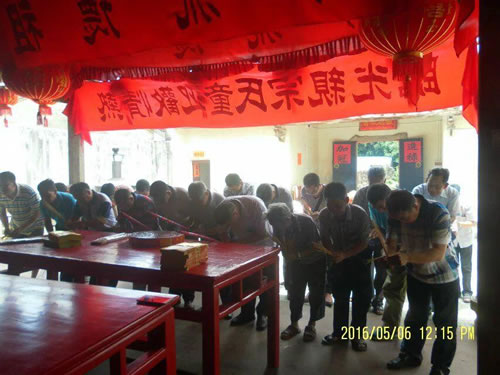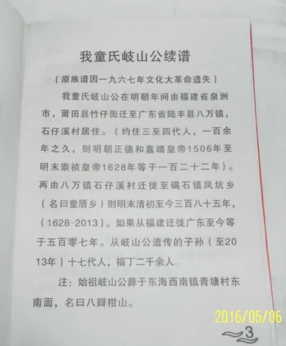 2016年5月6日,永定童姓代表10人、广东河源代表3人,拜访广东海陆丰童氏宗亲。广东汕尾陆丰市碣石镇童姓人口二千多人,分布童厝村、湖坑、西陂林。海丰市公平镇一百多人。先祖歧山公明朝未期从福建迁往广东,原族谱文革期间被毁,凭老人回忆,传先祖从福建泉州莆田迁入,近年来经多次联系都没结果。今年三月永定童氏祭祖,邀请普宁梓叔参加,因普宁童姓早期与海陆丰的宗亲有联系和来往,这次普宁宗亲也邀请海陆丰的宗亲参加,他们提前一天来到福建永定长化村,晚饭后,广福二地宗亲欢聚一堂,相互交流。福建永定长化村童姓与广东普宁的宗亲2011年在浙江淳安年会时己对上谱了,直至今年才亲人团聚。在交流族谱时海陆丰宗亲在福建永定童氏族谱中看到了他们多年来一直要寻找的祖先的根。海陆丰二地因族谱被毁,现在最宝贵的资料是保存下来的祖宗神位牌,神位牌记载的始祖、二世祖在永定童氏族谱上己记载的很清楚,而且迁到广东的原老小地名都很详细。后经二地重复认真核对,确定是从福建永定迁出的,终于圆了海陆丰童氏多年来的寻祖寻根梦。