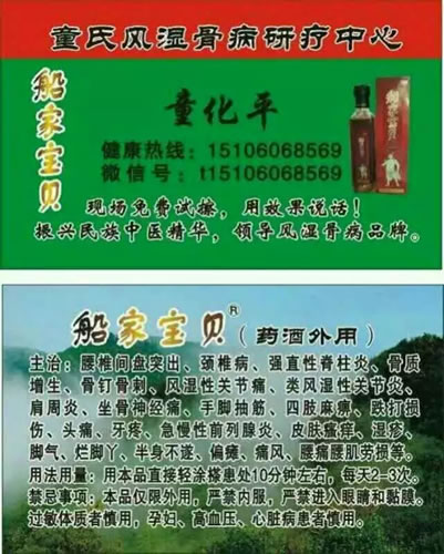 船家宝贝(药酒外用)销售火爆,用户反馈极佳。分别销往福建、江西、浙江、安徽、河南、云南、广东等地市场。对腰间盘突出、颈椎病、骨质增生、风湿性关节痛、肩周炎、痛风、腰肌劳损,有显著的效果。药材好,药才好。药材原料选择广西原始森林野生药材,优质选用四十九种珍惜动植物药材,采用中医萃壁耙向技术,具有极强的渗透力,有效药物成分能快速渗透患者病灶痛患深处,见效快,康复快。